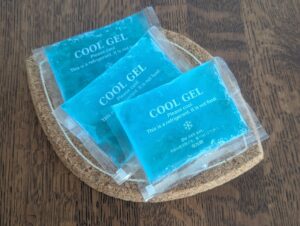 固まらないジェルタイプの保冷剤は肌にあたる感覚も優しくソフトなのでそちらがお薦めです。ハンカチやタオルにくるんでツボ付近に当てて見てくださいね。